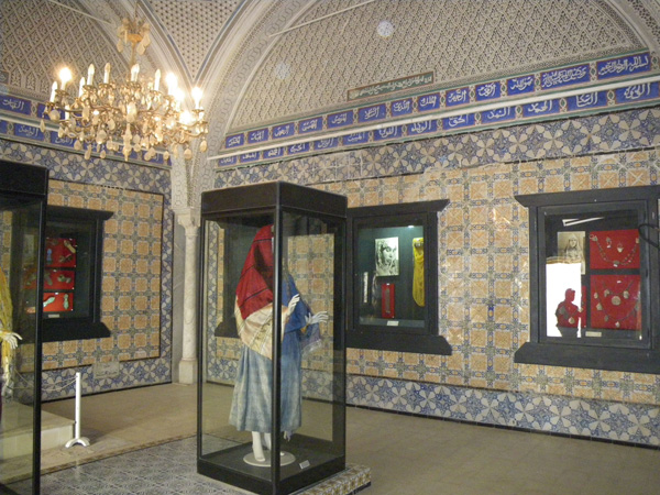 La vitrine centrale présente les costumes traditionnels des mariées d'El Kef, des tenues du premier au septième jour de mariage. Une autre vitrine présente plusieurs produits cosmétiques pour femmes et des articles tels que des flacons et des accessoires pour cosmétiques, maquillage et articles de toilette.